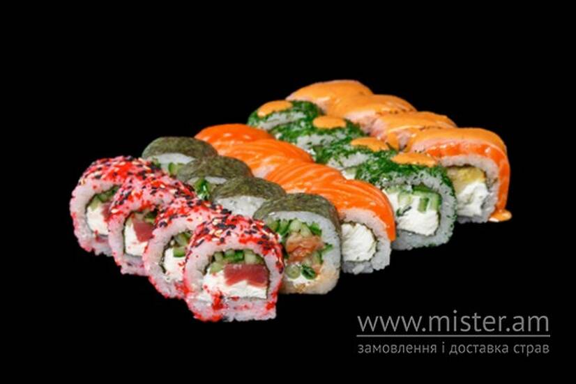 Філадельфія з сиром 1/2, Футомаки с копченым лососем 1/2, Рол з лососем татакі і ананасом 1/2, Рол Сакура з тунцем 1/2, Рол Орітцу 1/2.