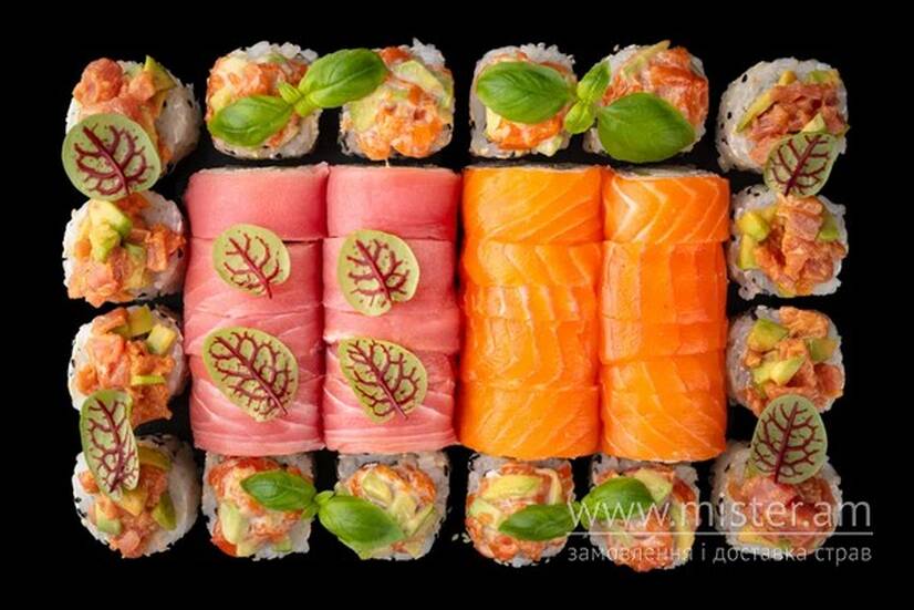 Філадельфія з лососем, Філадельфія з тунцем, рол Якудза з тунцем в кунжуті, рол Якудза з лососем в кунжуті.