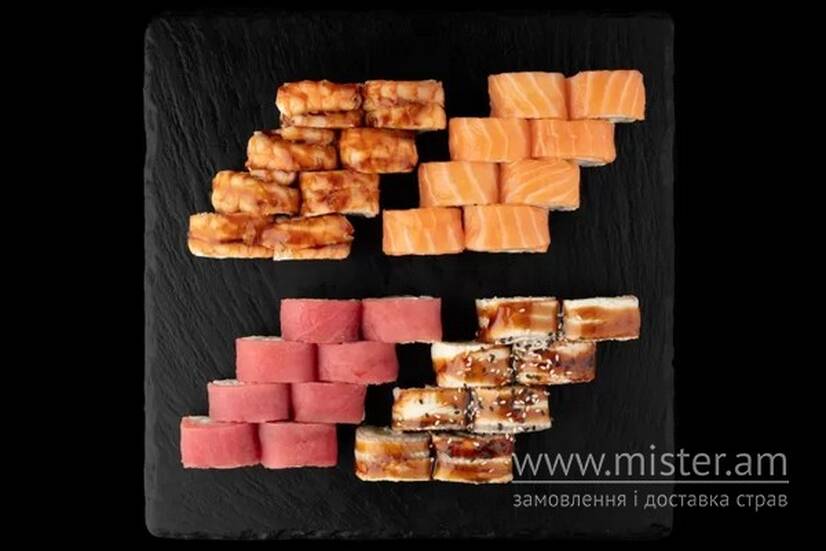 Філадельфія з тунцем, Філадельфія з креветкою, Філадельфія з вугрем, Філадельфія з лососем.