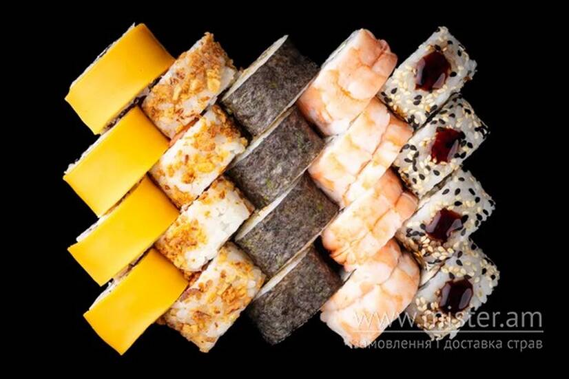 Філадельфія з креветкою і авокадо 1/2, Філадельфія з вугрем в кунжуті 1/2, футомакі з тунцем 1/2, сяке де люкс 1/2, рол сирний з копченим лососем 1/2.