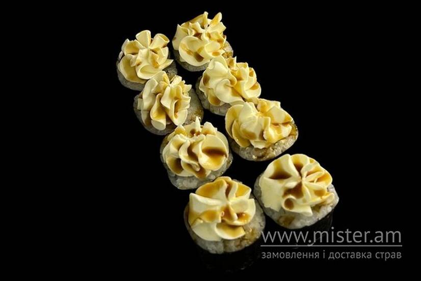 Норі, рис, крем-сир, огірок, краб, соус унагі, васабі та імбир.