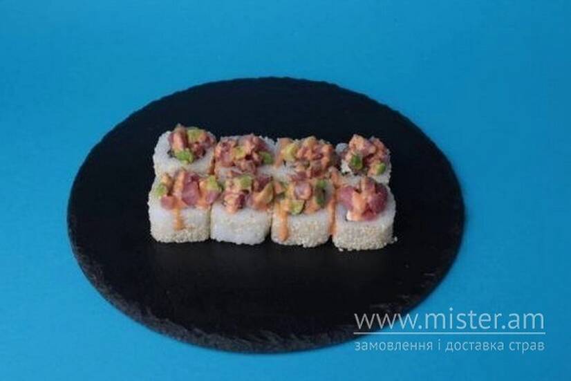 Тунець, авокадо, крем-сир, кунжут, соус спайсі, рис, норі, васабі та імбир.