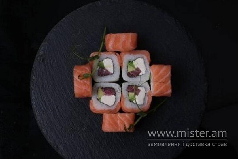 Лосось, тунець, авокадо, крем-сир, рис, норі, васабі та імбир.