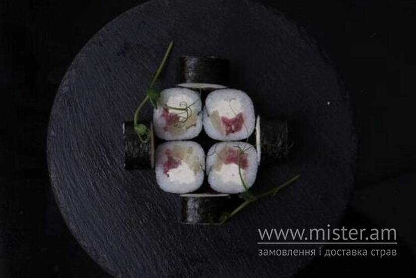 Тунець, ананас, крем-сир, рис, норі, васабі та імбир.