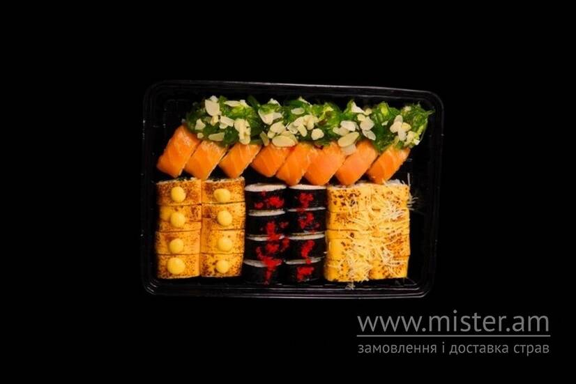 Філадельфія хіши, філадельфія лайт, сирний з тунцем, футомакі з креветкою, чіз рол, васабі та імбир.