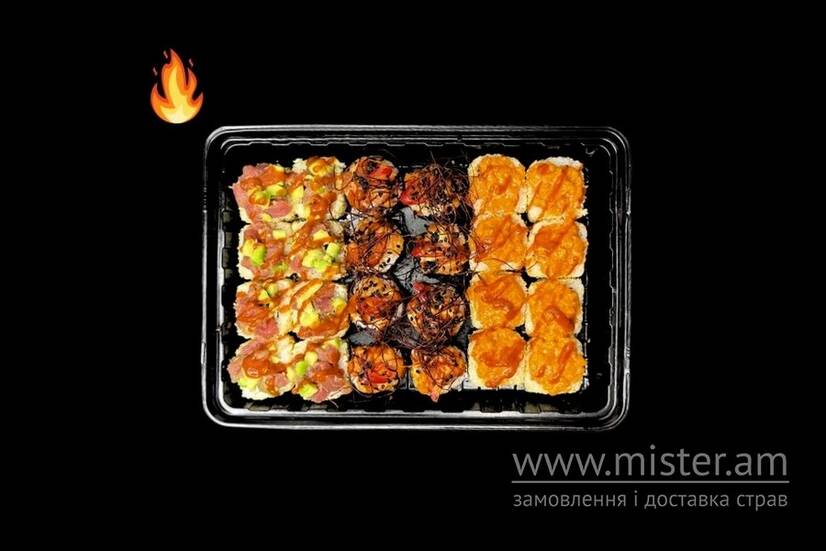 Спайсі з лососем, спайсі з тунцем, рол Чілі, васабі та імбир.