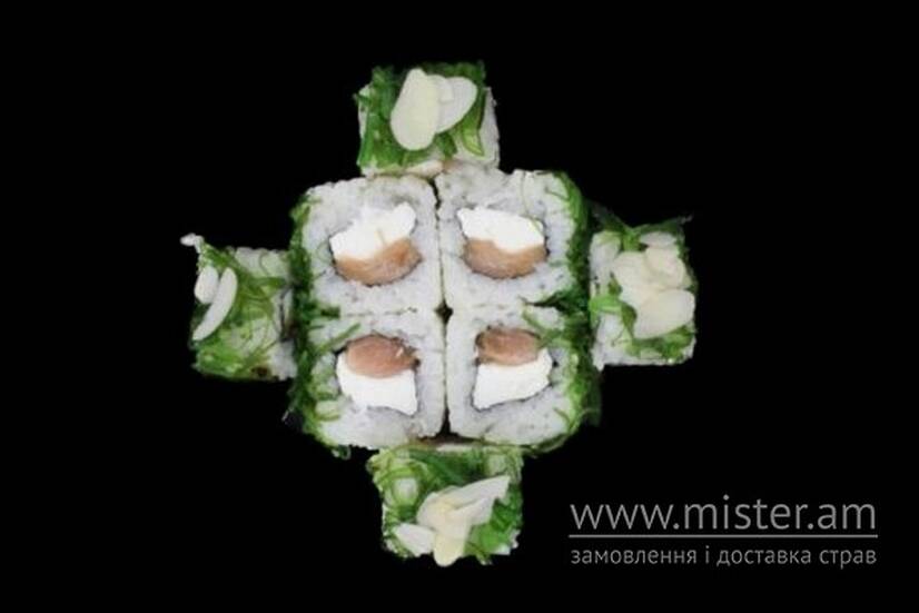 Рис, норі, крем-сир, чука, лосось, мигдалеві пластівці, васабі та імбир.