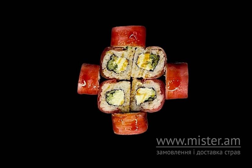 Рис, норі, крем-сир, огірок, тунець, соус унагі, васабі та імбир.