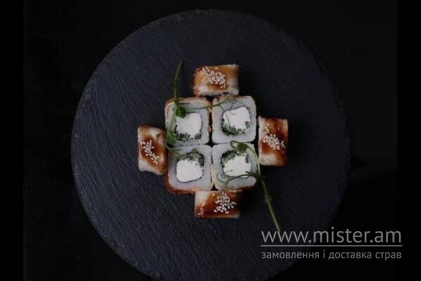 Вугор, огірок, крем-сир, соус, унагі, кунжут, рис, норі, васабі та імбир.