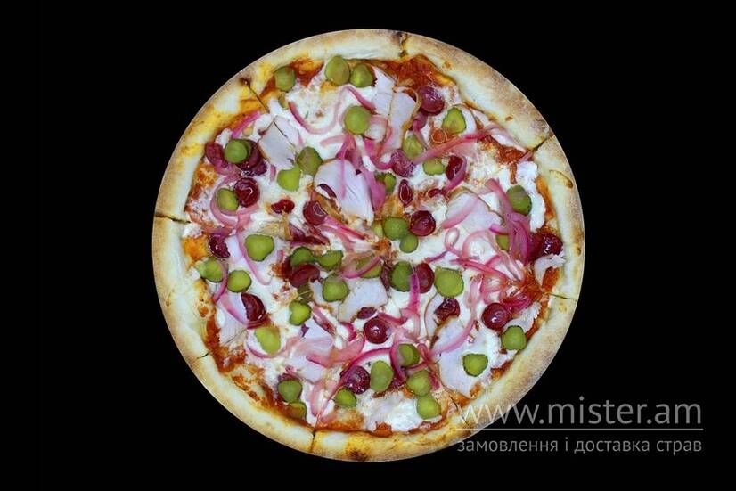 Сир моцарела, соус пілаті, мисливські ковбаски, огірки солоні, курка копчена, цибуля маринована.