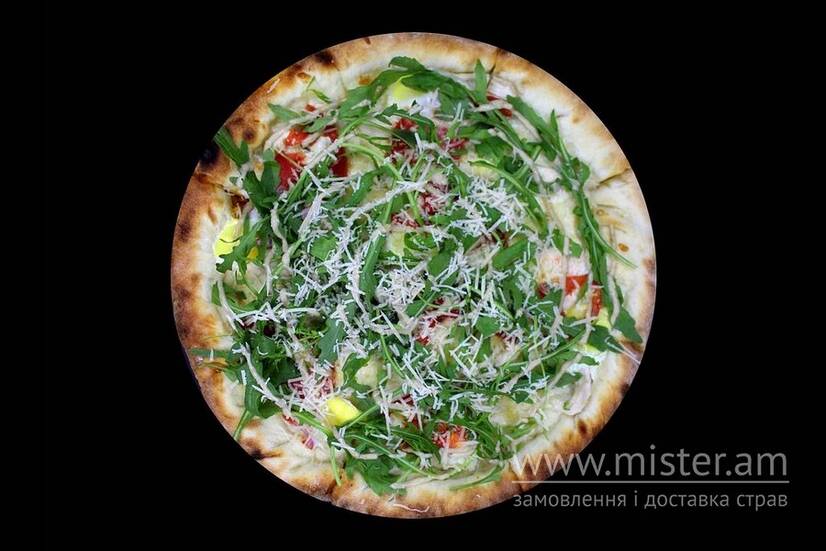 Соус вершковий, помідор, яйця перепелині, курка маринована, соус цезар, сир пармезан, рукола.
