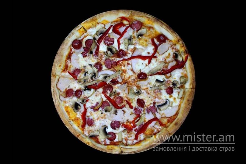 Соус пілаті, мисливські ковбаски, курка копчена, болгарський перець, сир моцарела, печериця.
