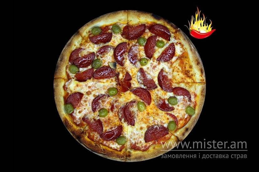 Соус пілаті, сир моцарела, салямі гостра, оливки зелені.