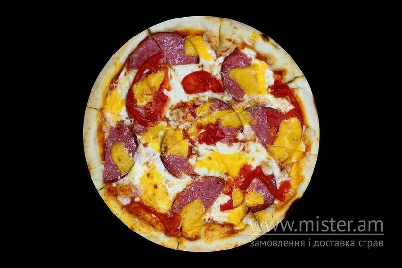 Соус пілаті, сир моцарела, салямі, сир чеддер, помідор.