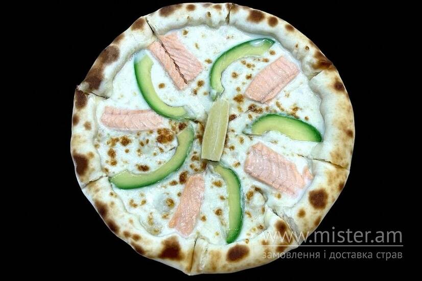 Соус вершковий, сир моцарела, лосось, авокадо, лимон.