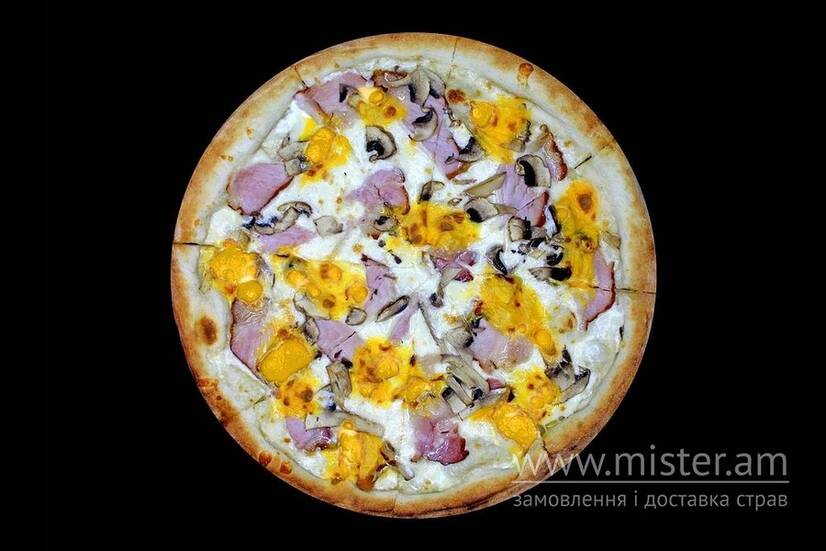 Соус вершковий, сир моцарела, шинка, печериця, сир чеддер.
