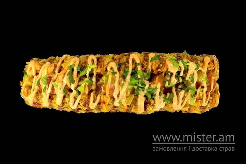 Рис, норі, лосось, крем-сир, дайкон, цибуля зелена, темпура кляр, панко сухарі, начос, унагі соус, спайсі соус, лимон.