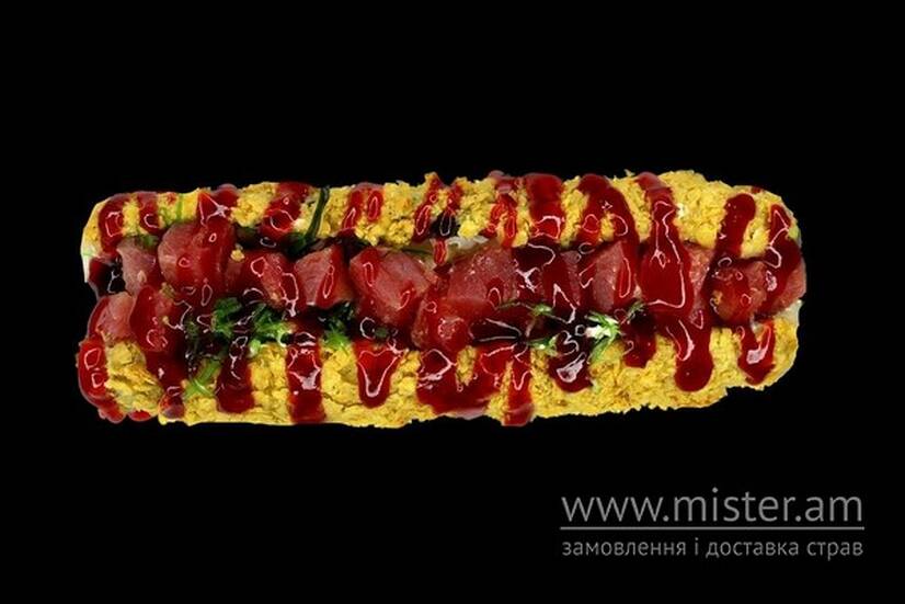 Норі, рис, тунець, хіяши, крем-сир, соус журавлиний, темпура кляр, начос.