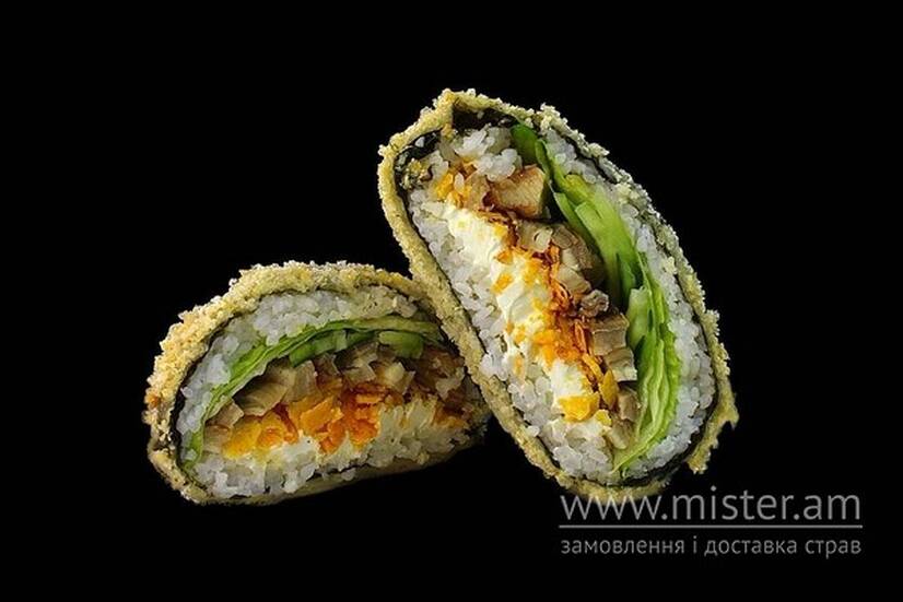 Рис, норі, вугор, айсберг, начос, огірок, соус Спайсі, соус Унагі, крем-сир, темпера-кляр, панко-сухарі.