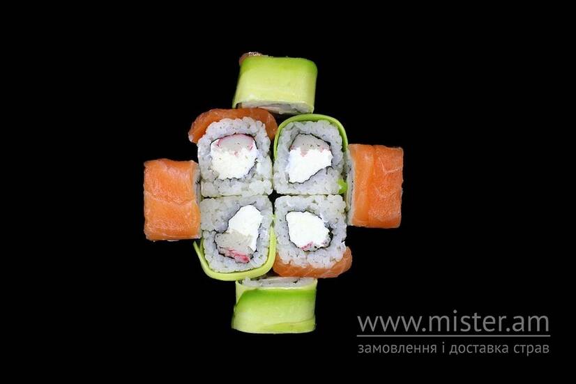 Рис, норі, крем-сир, краб, авокадо, лосось, васабі та імбир.