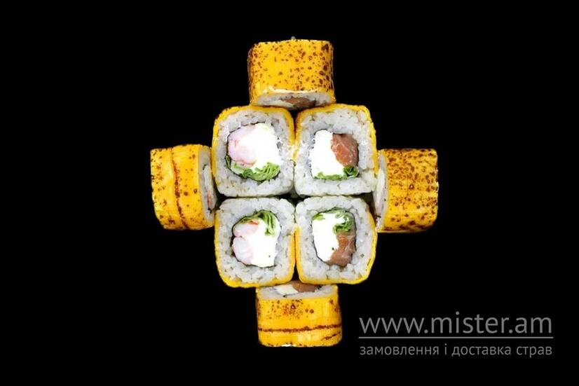 Рис, норі, крем-сир, айсберг, лосось, креветка, чеддер, васабі та імбир.