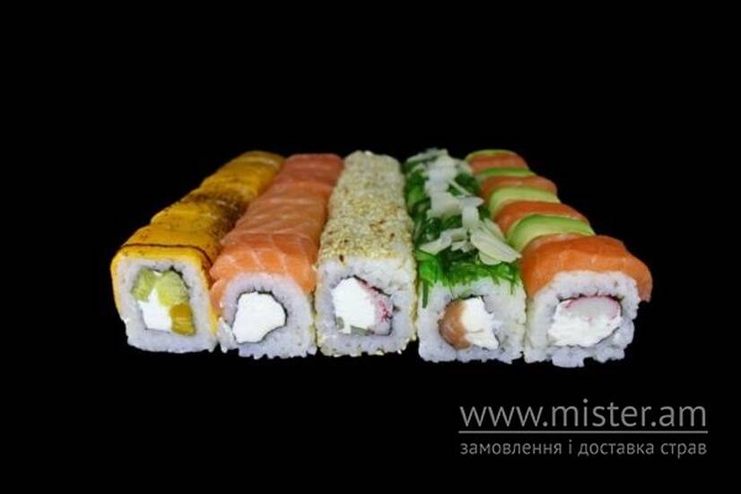 Філадельфія лайт, Філадельфія в кунжуті з крабом, Сирний з ананасом та манго, Філадельфія Хіяші, Інь-Янь, васабі та імбир.