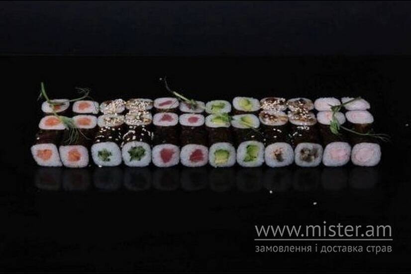 Макі лосось, макі огірок, макі тунець, макі авокадо, макі вугор, макі креветка, макі з сиром, васабі та імбир.