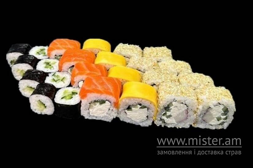 Макі з огірком, Філадельфія лосось/чеддер, Філадельфія в кунжуті з крабом, васабі та імбир.