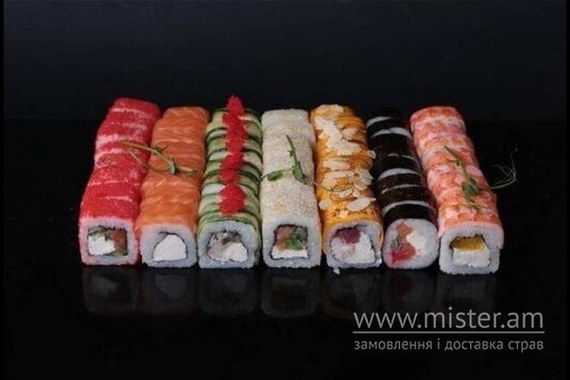 Каліфорнія з лососем, Філадельфія лайт, Зелений дракон, Філадельфія в кунжуті з лососем, Ф’южен, футомакі з лососем, Філадельфія з криветкою, васабі та імбир.