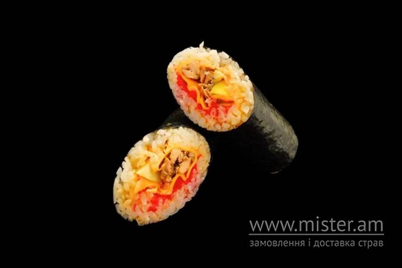 Норі, рис, запечений лосось, соус кімчі, ікра масаго, чедер, яблуко.