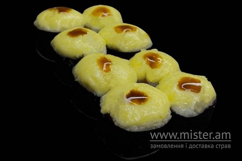 Курка копчена, огірок, майонез, сир пармезан, рис, норі, соус унагі, васабі та імбир.