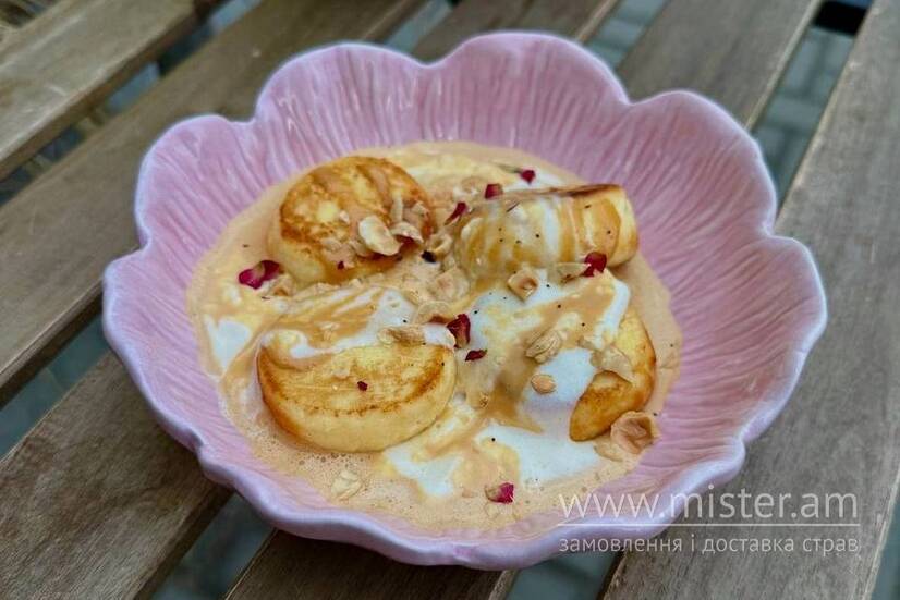 Ніжні сирнички з двома видами соусів на основі крем сиру, вершків, вареного згущеного молока та ряжанки з додаванням лісового горіху.