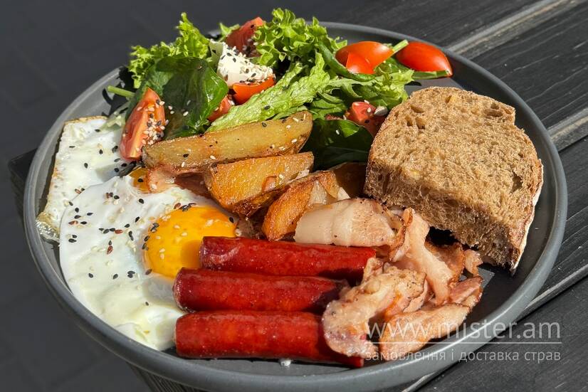 2 смажених яйця, мисливські ковбаски, смажений бекон, картопля по-селянськи, овочевий салат та бездріжджовий хліб.