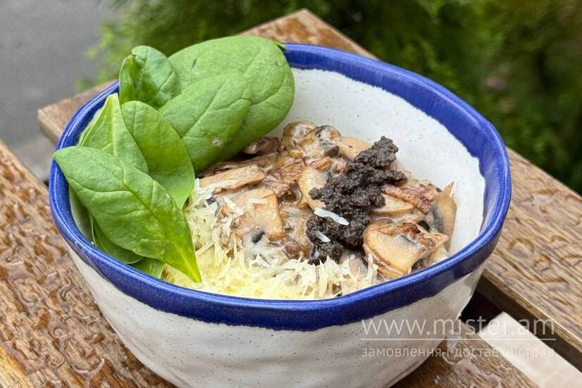 Цільнозернова вівсянка з грибним соусом, з додаванням трюфельної пасти та пармезану.