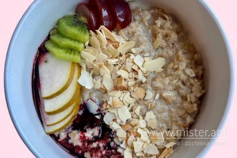 Вівсяна каша, зварена на молоці з вершковим маслом та ягідним соусом. Подається з сезонними ягодами та фруктами.