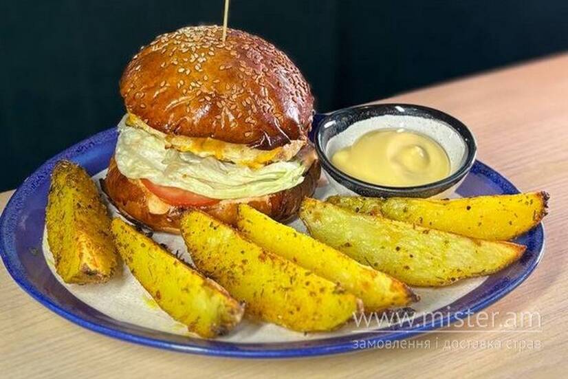 Бургер з куркою з соусом дорблю та картоплею по-селянськи