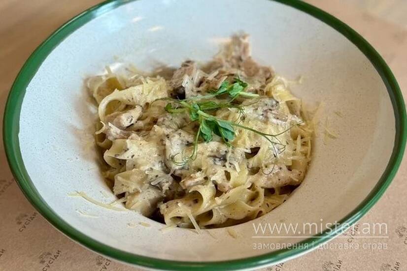 Паста фетучіні зі смаженою індичкою та печерицями, трюфельною пастою, вершками та пармезаном.