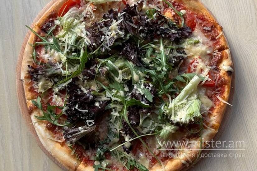 Піца Цезар з томатним соусом, філе маринованої індички, пармезаном, сиром моцарела, помідором черрі, міксом салату та соусом цезар.