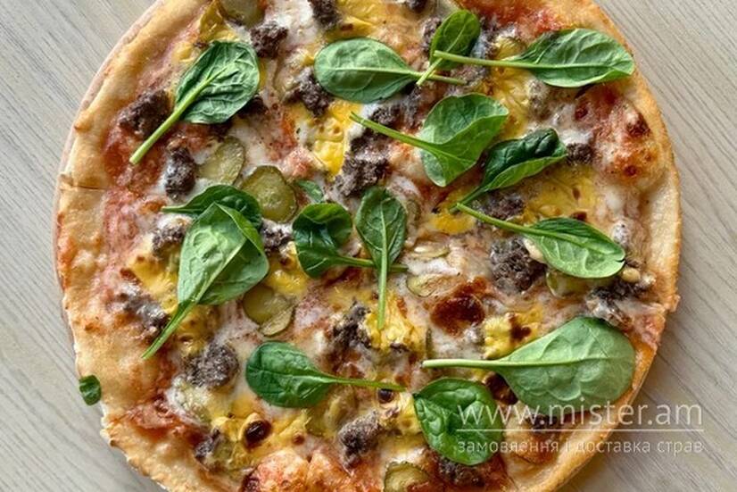 Піца чізбургер з томатним соусом, фаршем з яловичини, сиром чеддер, моцарелою, маринованим огірком.