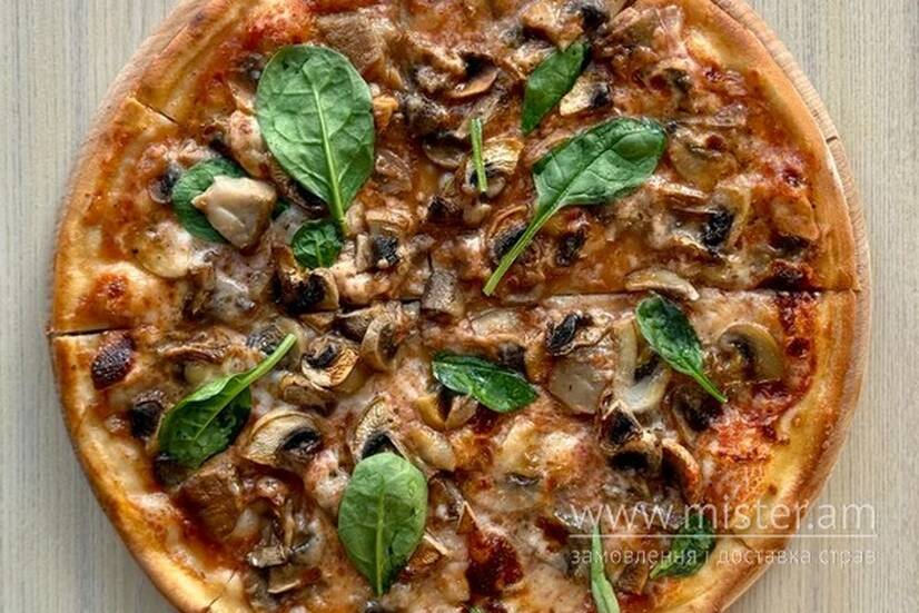 Піца грибна з томатним соусом, сиром моцарела, печерицями маринованими в трюфельній пасті.
