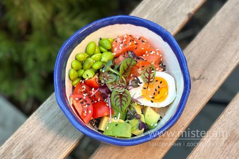 Боул зі слабосолоним лососем, кіноа, авокадо, яйцем, чері та зеленою квасолею під горіхово-соєвим соусом.