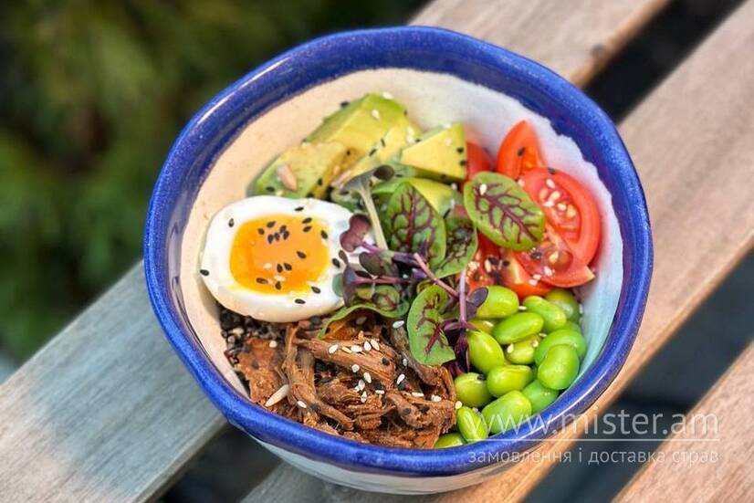 Боул з томленою телятиною, кіноа, авокадо, яйцем, чері та зеленою квасолею під горіхово-соєвим соусом.