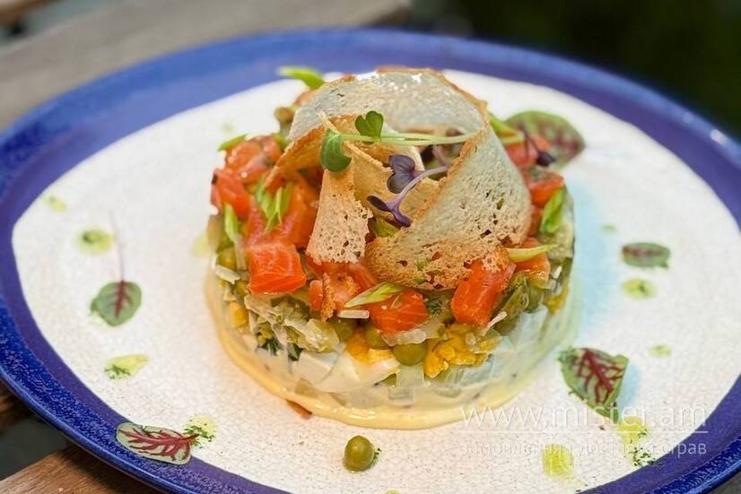 Олів`є зі слабо солоним лососем, свіжим та маринованим огірком, горошком, картоплею та яйцем, заправлений домашнім майонезом.