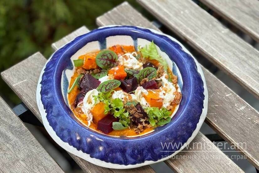 Запечені гарбуз та буряк на подушці з вершково-гарбузового соусу з додаванням в`ялених томатів та ніжним сиром страчателла, заправлений соусом вінегрет.