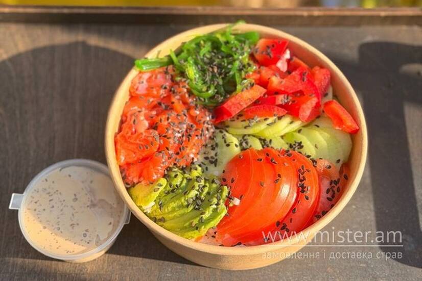 Рис, слабосолений лосось, авокадо, болгарський перець, огірок, чука, горіховий соус, кунжут.