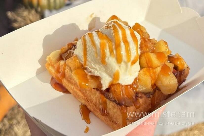 Бельгійська вафля, шоколадна паста, сезонні фрукти або ягоди, морозиво, топінг.