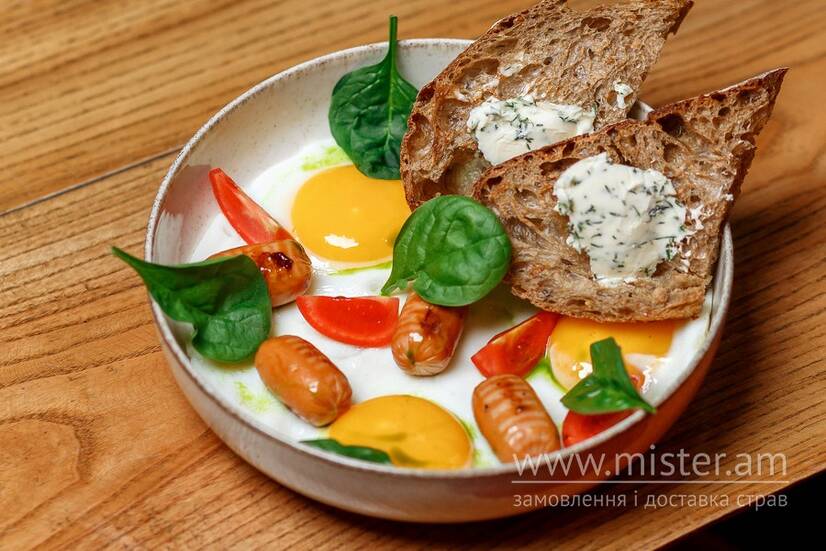 Яйця курячі, міні сосиски, томати чері, масло вершкове з зеленню, хліб крафтовий.