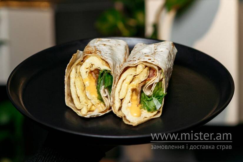 Омлет, бекон, лаваш, салат айсберг, соус сирний, соус Цезар.