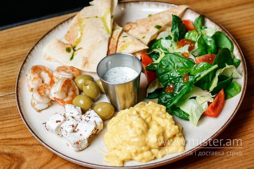 Креветки, скрембл, фета в травах, оливки, піта, шпинат, салат айсберг, чері, соус Дзадзикі, заправка з в`ялених томатів.