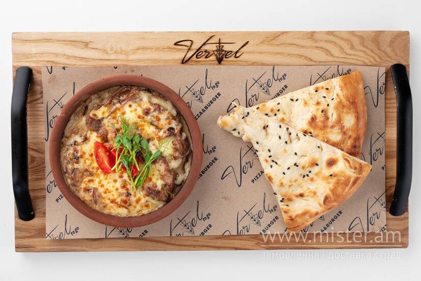Цибуля синя, телятина, печериці, вершки, сирне фондю, чері.